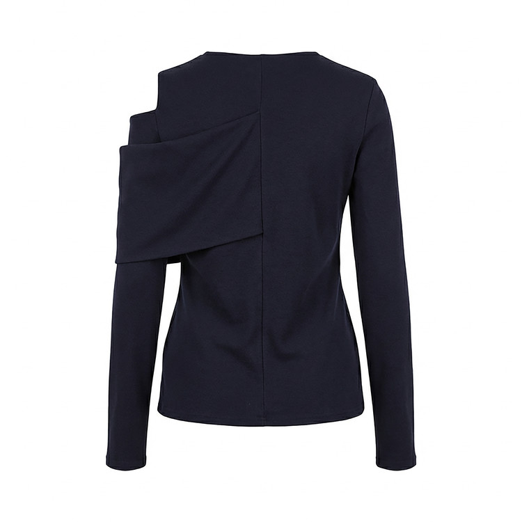 An asymmetric off-shoulder design that creates a structural and stylish look.