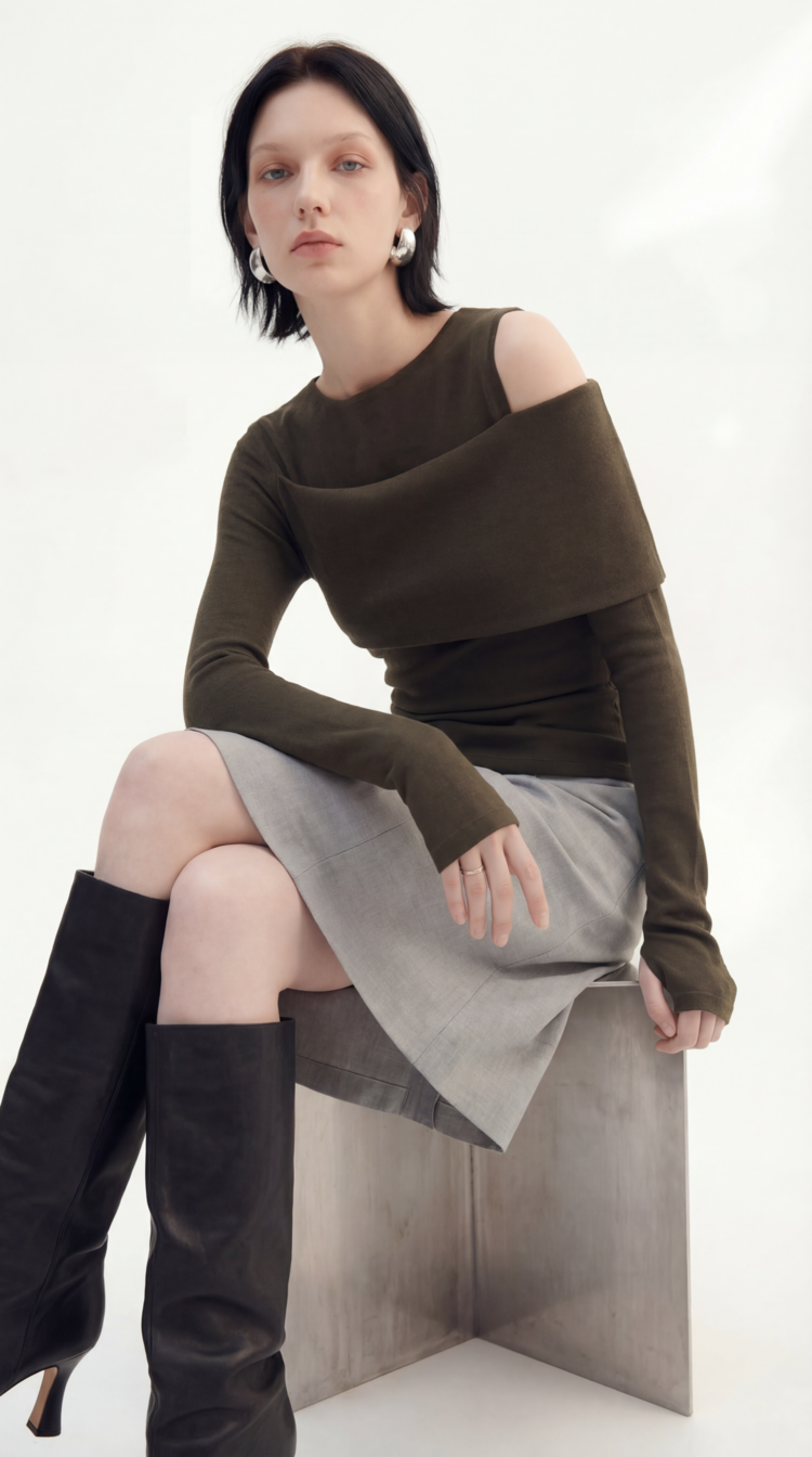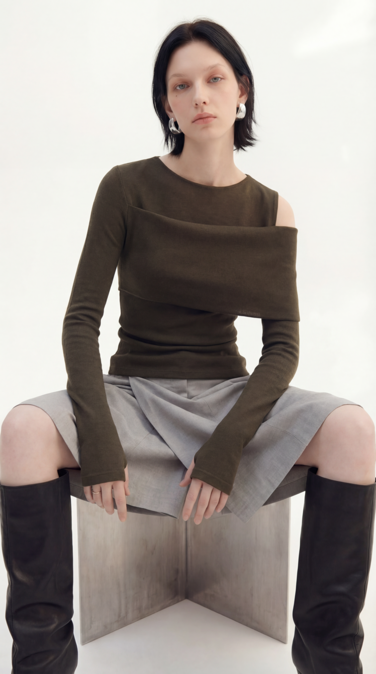 An asymmetric off-shoulder design that creates a structural and stylish look.