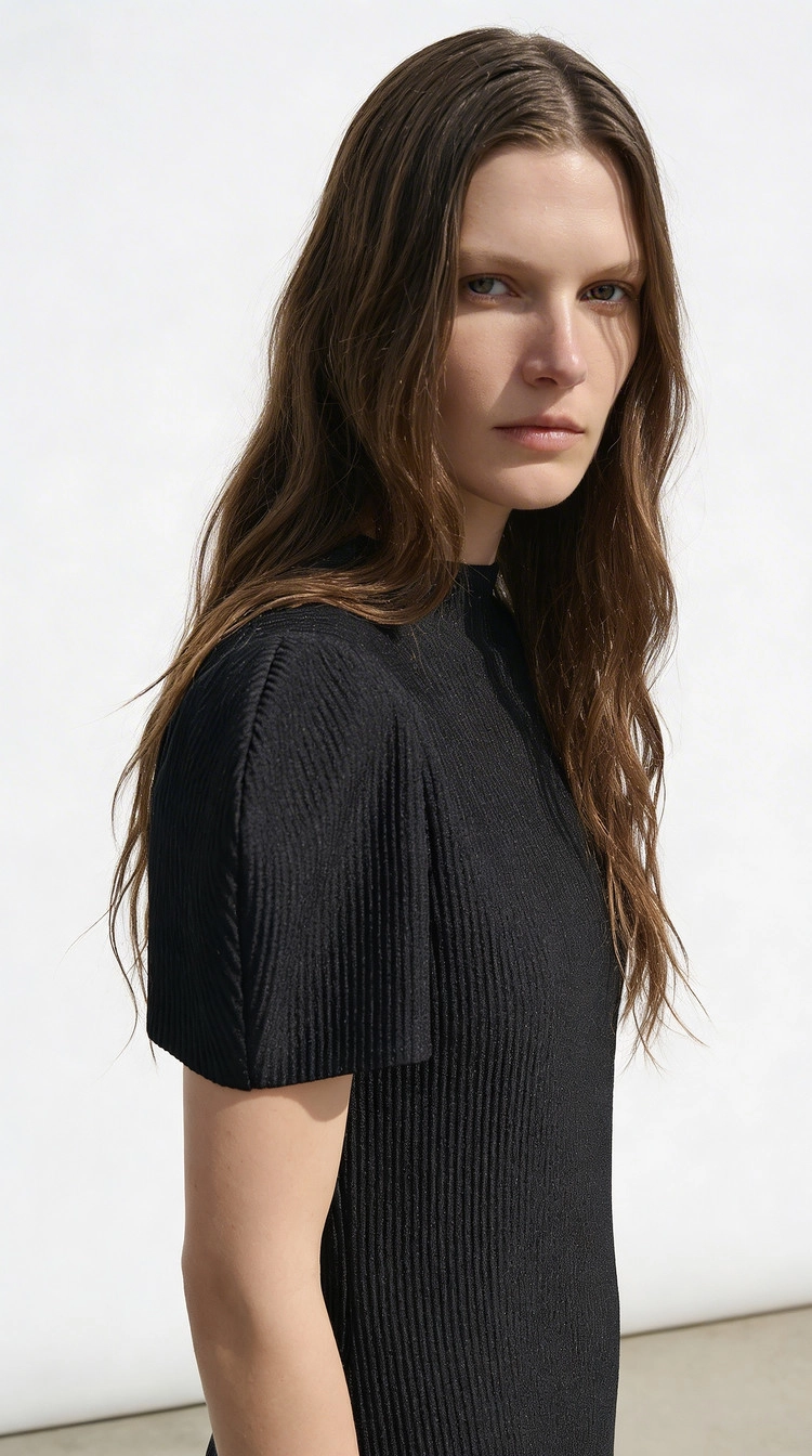 Crewneck collar with turtleneck-style trim for alternate styling.