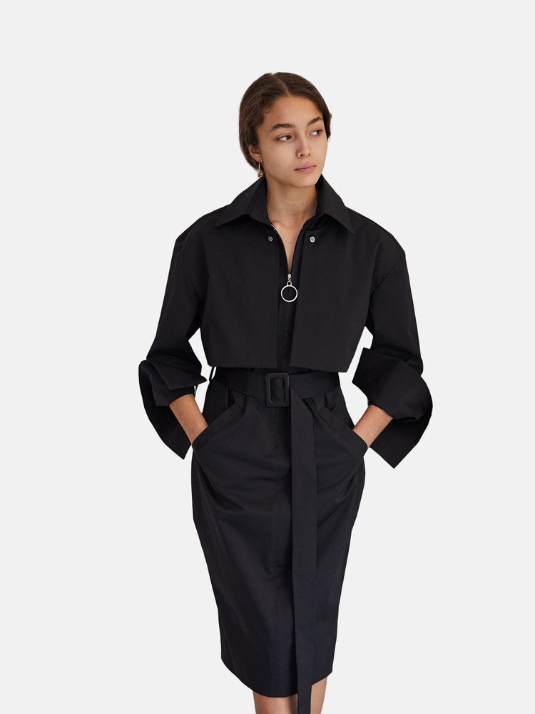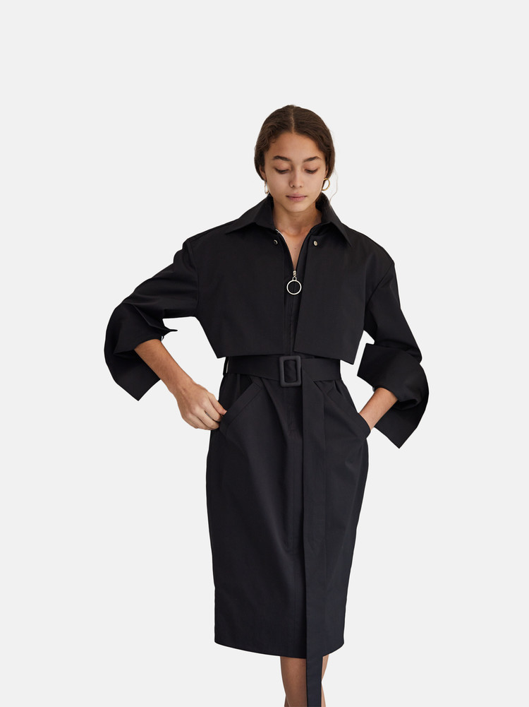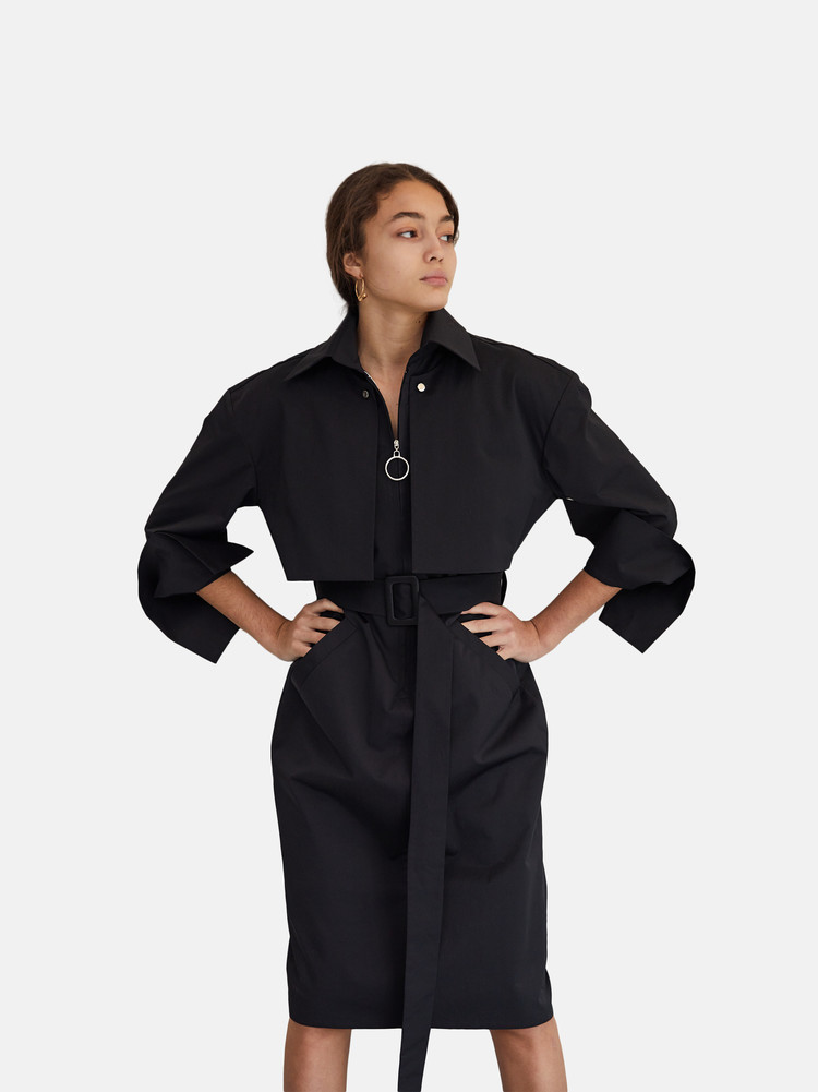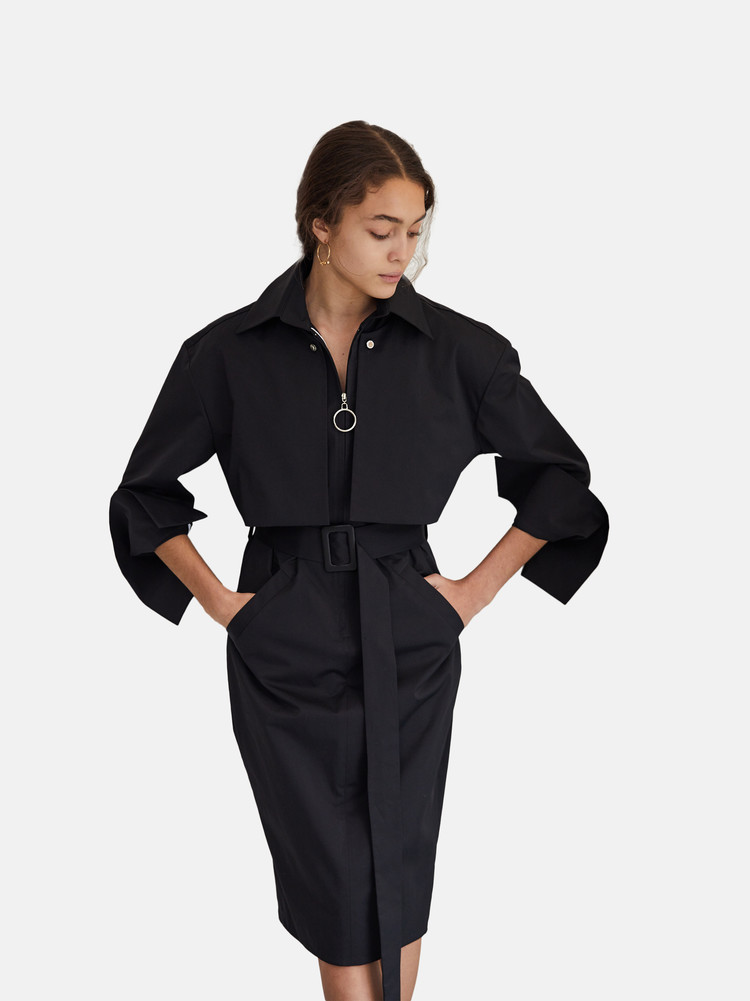 Long sleeve trench dress in black.